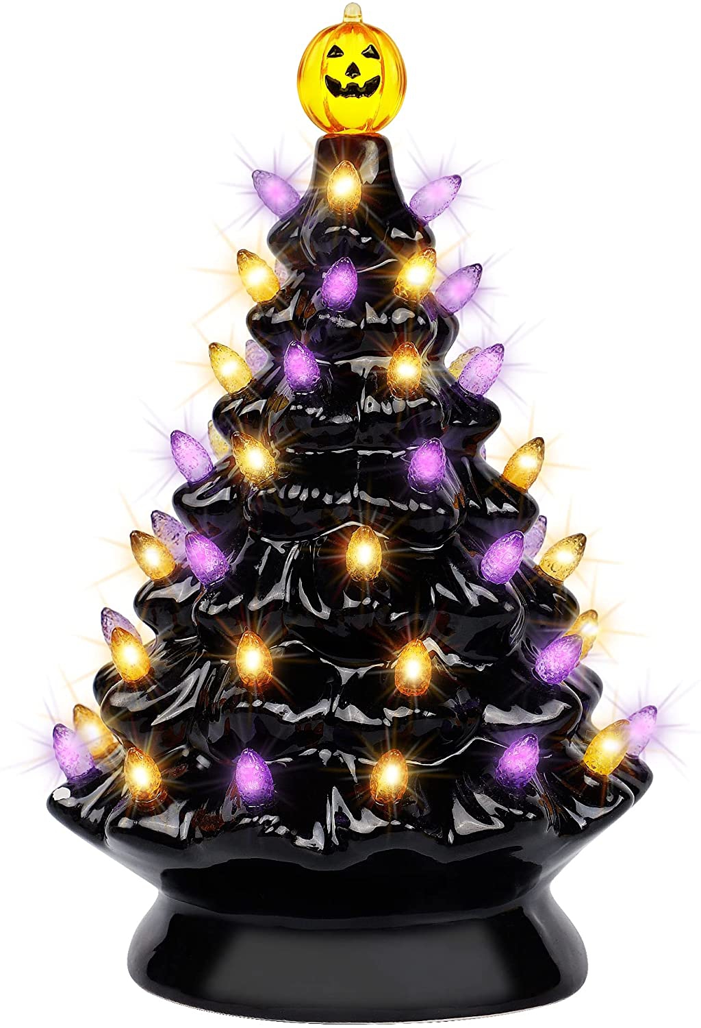 yofit Halloween Decorations 9 Inch Ceramic Tree, Pre-Lit Pumpkin Tabletop with Purple Orange Lights for Kitchen Home Holiday Party Office