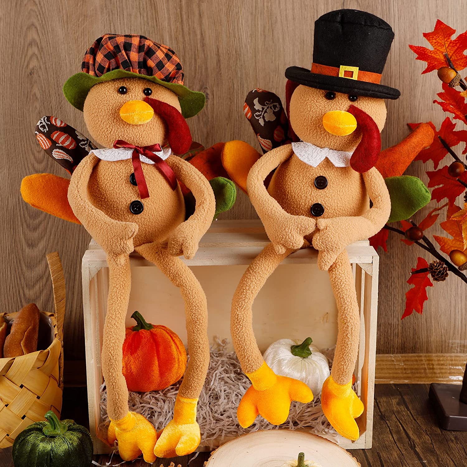 yofit Thanksgiving Decorations Plush Turkeys, Set of 2 Mr and Mrs Turkey Tree-Hugging Poseable Doll, Hanging Fall Harvest Decor for Home Table Tree Fireplace